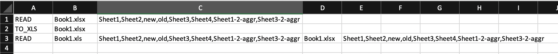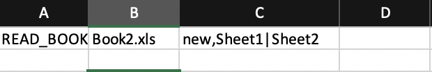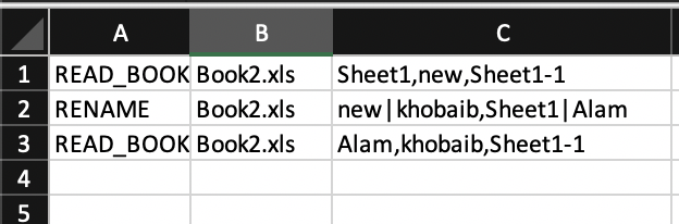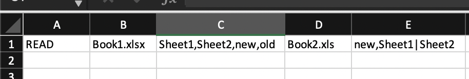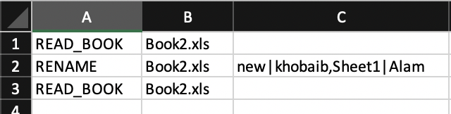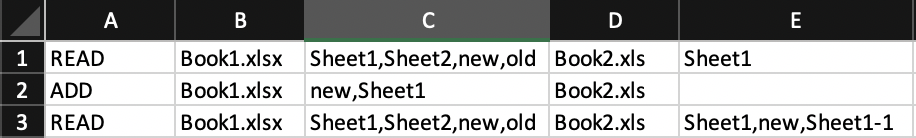 The arguments in different cells are source book followed by ',' separated sheets with their original name and new name separated by '|'.