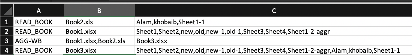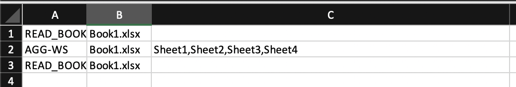 The arguments in different cells are workbook name followed by the ',' separated sheet names. If sheet names are not provided then all the sheets will be aggregated with similar headers of that work book.