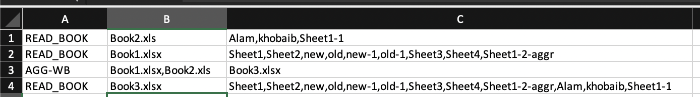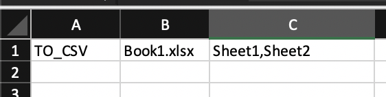 The agruments in different cells are WorkBook name followed by the list of ',' separated WorkSheet names to be converated to csv format.