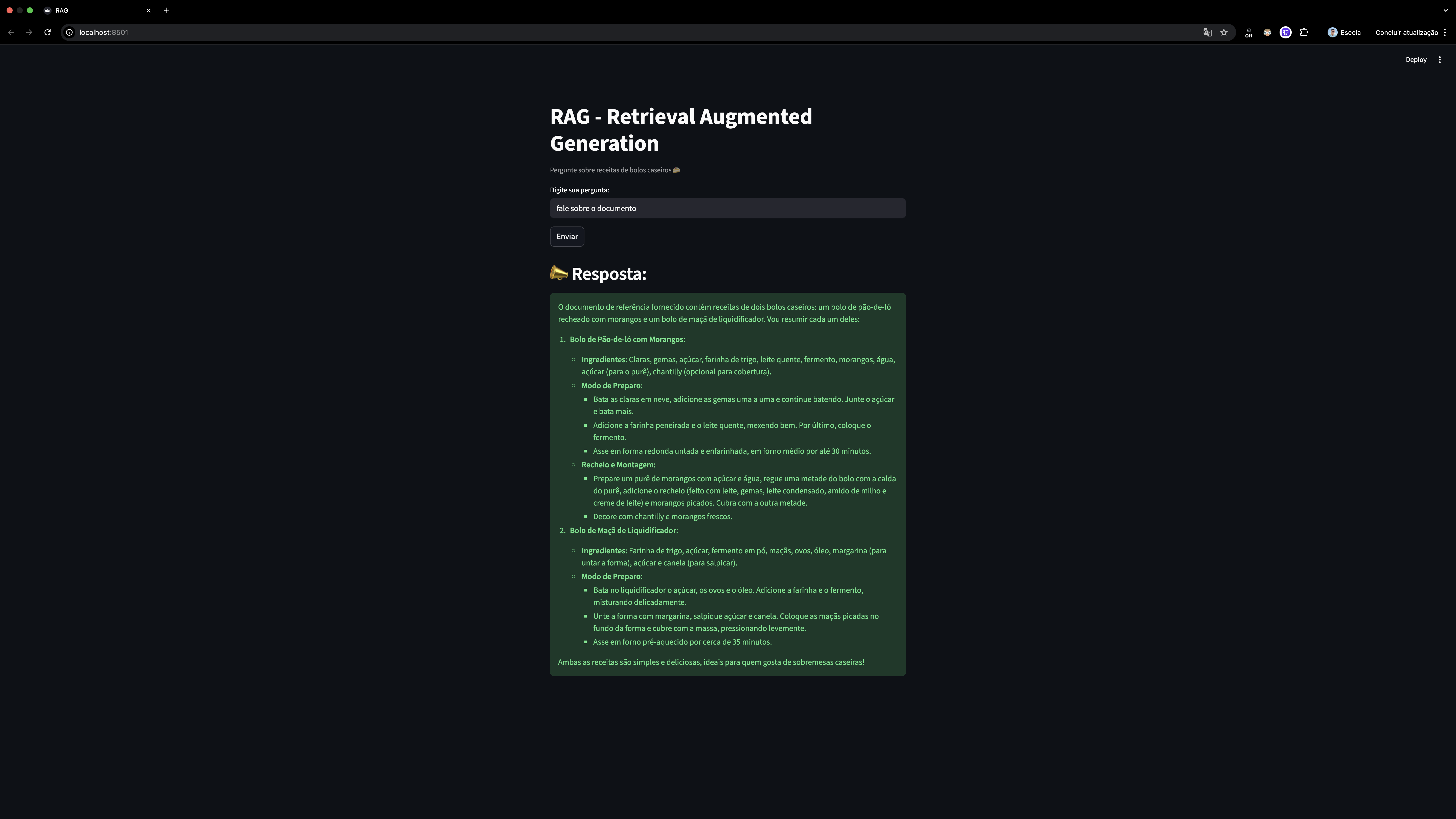 Para demonstração, foi utilizado um PDF contendo receitas de bolos caseiros, servindo como exemplo de aplicação prática.