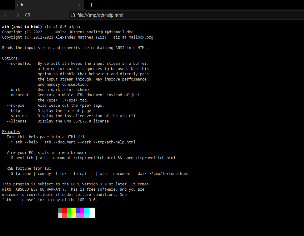 sudo make installThe command line tool reads the input stream and converts the containing ANSI