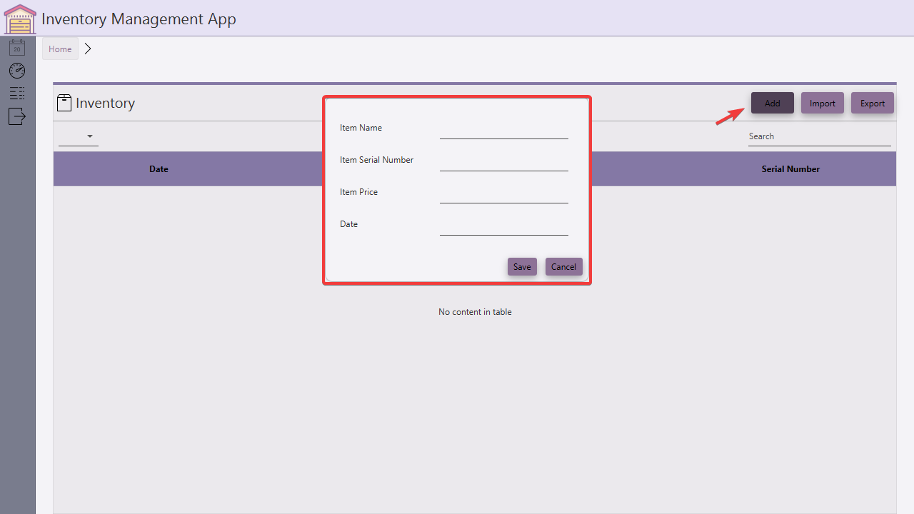 This program allows user to add, remove, edit, export and import items. Each Item have 4 properties that can be defined by the user (3 of them have to be difined and 1 is optional) Properies which have to be initialized are Name, Price and Serial Number (Date is optional).