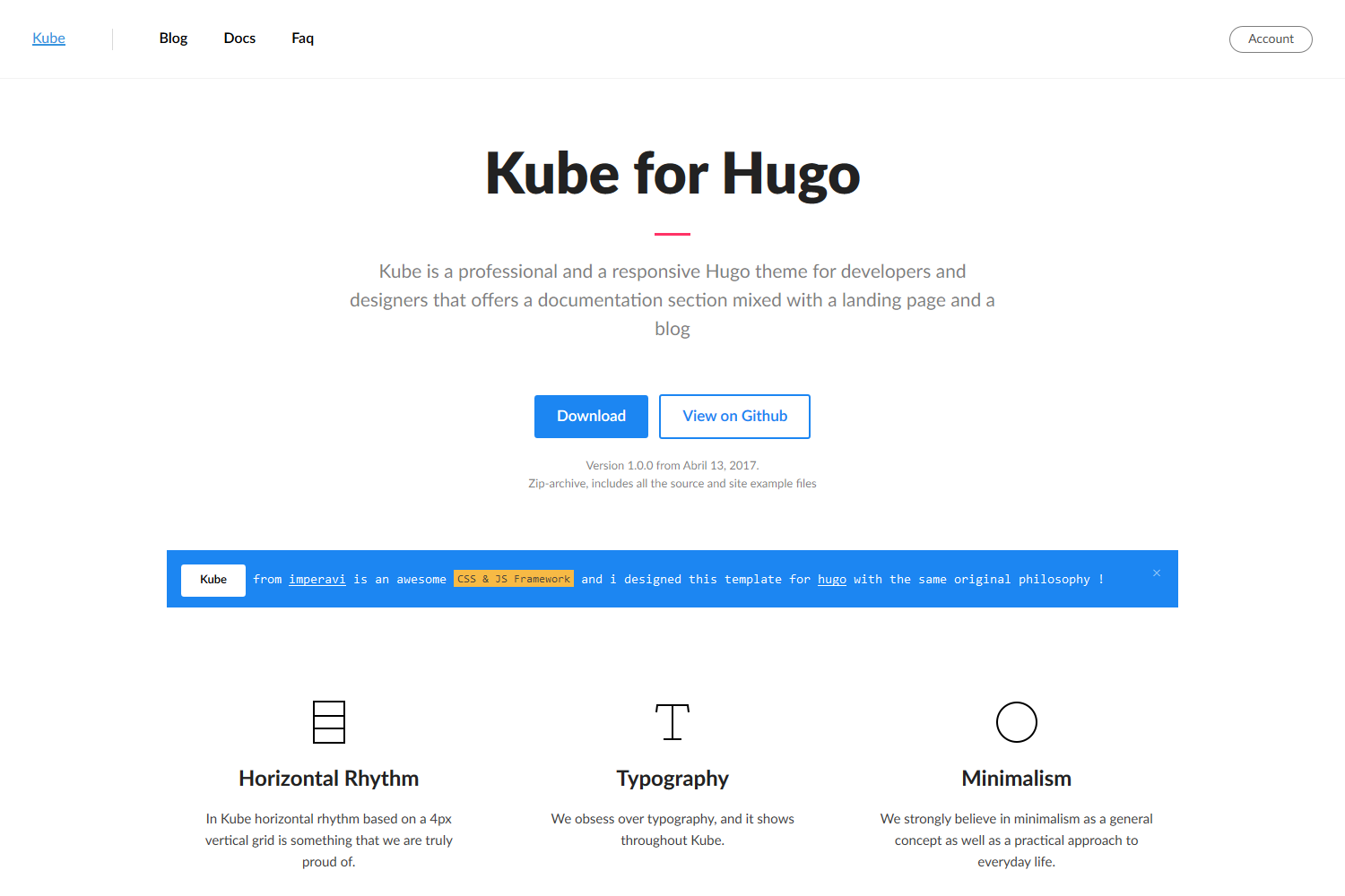 kube Kube is a professional and a responsive Hugo theme for developers and designers that offers a documentation section mixed with a landing page and a blog.