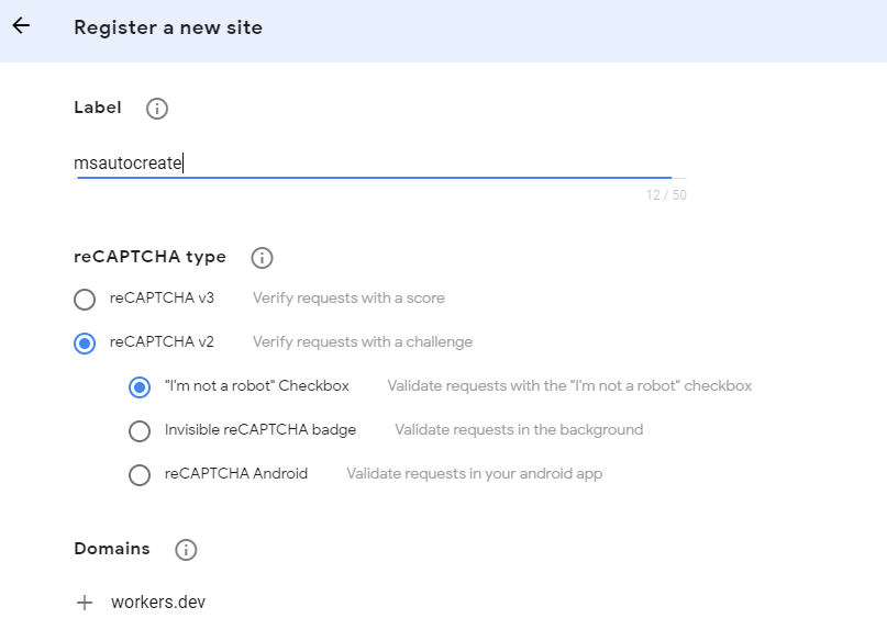 5 配置 reCAPTCHA,前往 https://www.google.com/recaptcha/intro/v3.html 新建一个 reCAPTCHA v2 checkbox 验证,填入你的域名,获取 site key 和 secret