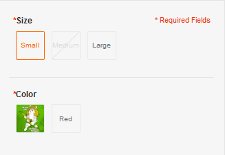 Yesthen the customer will be able to click on the labels for the out of stock combinations and select them. He will still get an error when trying to add it to the cart. If it is set toNothe labels for out of stock combinations will be disabled. - Use simple product images instead of labels for attributes: This allows you to select the attributes that will have images instead of labels. (useful if you have different color combinations). If the simple product does not have an image available then the label with the attribute value will be displayed. (see the first image for the "color" attribute).