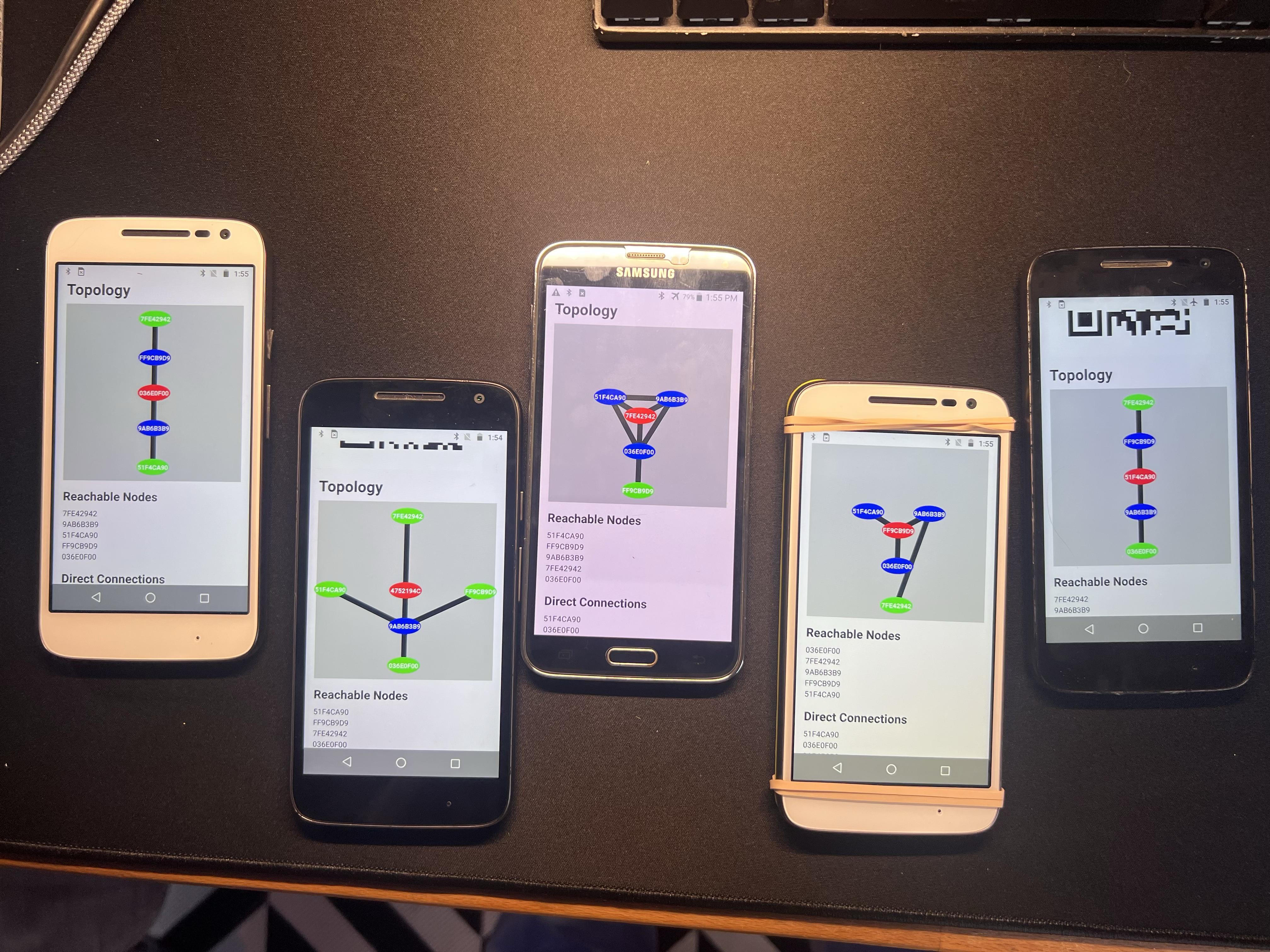 - Android Devices can only pair to a maximum of 7 devices at a time, which means that without any master planning of the topology, the mesh will eventually struggle to grow as devices favor existing connections. I implemented a system to drop connections after a certain amount of time, but I hypothesize that at scale, this won't be enough.