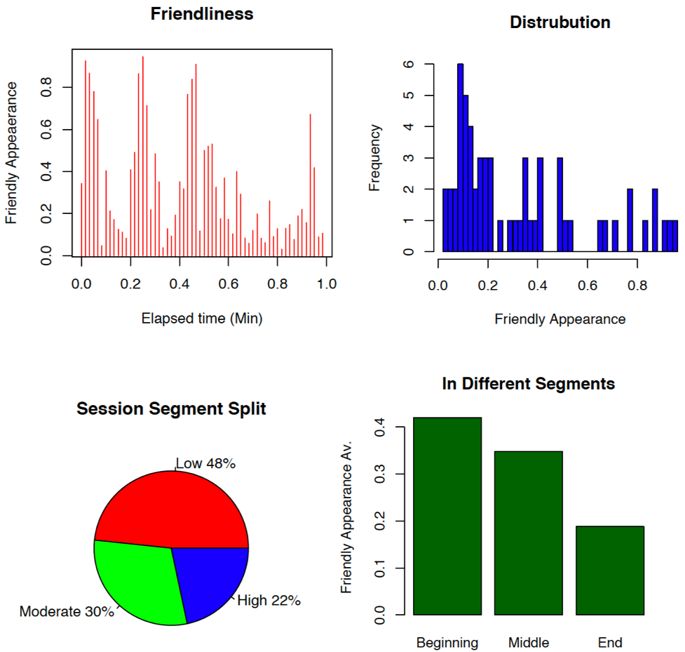 The client codebase consists of multiple Python and R scripts designed for various functions ranging from controlling the Vision Kit remotely to processing the data after a collection cycle. The client automatically generates reports of the Facial Emotional data for a given data collection cycle. Some example reports look like: