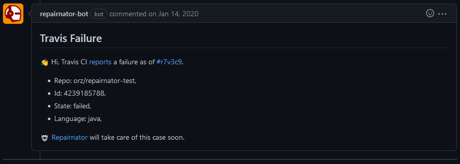 Software bots in Software EngineeringBARTHELAT Etienne - CONDORI Miguel - LEMAITRE Lucas - MOLL Jean-Loup - JUGIEAU Théo L'objectif de cette PR est de présenter différents bots servant à automatiser des tâches sur des dépôts git. Renovatebot :Ce bot sert à mettre à jour les dépendances dans un projet dès qu’il en trouve de nouvelles, il va donc émettre des pulls requests sur le repos (github, gitlab, bitbucket …) et même les auto-merger (si paramétré ainsi). Remarque : L’installation est directe pour github sinon l’application doit être self-hosted. Installation sur un repos github : Puis Ensuite, rendez-vous sur GitHub Apps - Renovate pour configurer le bot sur un projet spécifique si ce n’est pas déjà fait avec la phase d’installation. Après l’installation et configuration, le bot va émettre une première pull request sur votre dépôt afin de créer un fichier renovate.json qui contiendra les paramètres du bot que vous pourrez alors modifier par la suite si besoin. Par exemple, on peut ajouter l'option d'auto-merging des PR : On peut trouver les autres options de configuration ici Exemple d'une pull request réalisée par le bot : Rultor, a DevOps team assistantRultor permet d'automatiser les opérations git comme merge, deploy et release avec une interface chat-bot intégré dans les commentaires d'une pull request. Lors d'une pull request, lorsqu'on va lui demander, Rultor va récupérer la branche master et y appliquer les modifications proposés. Il va ensuite tout exécuter sur son Docker et si tout se passe bien sans erreurs, il va merge la branche dans la branche master. Cela permet de réduire les risques que les développeurs cassent la branche master en faisant une pull request contenant des erreurs. Grâce à cela, les développeurs ont moins peur de faire des erreurs et augmente leur productivité. Comment mettre en place Rultor ?Dans un premier temps, il faut récupérer Rultor dans le Marketplace de Git et récupérer le fichier rultor.yml de ce dépôt qui sera à mettre à la racine du projet. Tout d'abord il faut créer un serveur Ubuntu accessible via l'adresse Il faut ensuite configurer le serveur pour donner les droits d'accès à Rultor. Puis, nous devons créer l'image que le docker va devoir utiliser. On créé un conteneur Nous envoyons ensuite l'image sur le hub Docker Enfin, pour exécuter Rultor, il suffit de faire une pull request sur la branche master du projet git et écrire Créer son propre bot avec Probot :Prérequis : npm, node, npx installés sur votre machine/!\ La doc indique une version de node au moins 10, mais ce n'est pas à jour : il faut une version strictement supérieure à la 10 (nous avons fait avec la 12). Pour l’installation de node, nous conseillons de passer par le gestionnaire de package nvm. Installation nvm : Installation node/npm : Installation npx : Probot :Exécutez Un répertoire se crée alors, allez-y puis exécutez Rendez-vous ensuite sur votre navigateur à l’adresse indiquée dans votre navigateur. Ensuite suivez les indications, ajoutez votre bot à un repos (cf renovatebot). Une fois fait, redémarrez le serveur: Ctrl+C, puis C’est donc là que va commencer la partie intéressante qui va être la personnalisation du bot, qui est contenue dans le fichier index.js de votre bot. Vous retrouverez la documentation des webhooks events associés à github ici RepairnatorRepairnator est un bot conçu pour aider au développement de programmes Java. Il peut automatiquement identifier et corriger les erreurs dans le code Java en trouvant les erreurs et selon le type d'exception, en trouvant un patch qui peut être appliqué au code pour remédier à l'erreur, ce qui facilite la construction et la maintenance de projets pour les développeurs. Dans le cadre de ce projet, nous avons exploré Repairnator en tant qu'application Github et en tant que plugin Maven car ce sont les déploiements les plus développés du bot. Cependant, il convient de noter que le bot est également disponible en tant qu'outil de ligne de commande, scanner Travis CI et en tant que scanner avec Flacocobot. Comment installer Repairnator sur GitHubPour utiliser Repairnator dans un dépôt GitHub, vous aurez besoin d'avoir un compte Travis CI valide. En plus d'avoir l'application Travis Ci github active sur le repository. Assurez-vous que le bot est actif dans le dépôt correct. Dans la racine de votre dépôt, créez un fichier .travis.yml qui inclut les étapes pour que Travis construise votre projet. Par exemple : Finalement assurez-vous que le fichier .travis.yml contient la ligne : Pour que Repairnator sache qu'il doit être actif. Comment installer Repairnator dans un projet MavenPour utiliser Repairnator dans un projet Maven, vous devrez installer le plugin Repairnator en l'ajoutant en tant que plugin dans le pom.xml. Comment utiliser RepairnatorUne fois que vous avez installé Repairnator dans votre dépôt GitHub ou votre projet Maven, il essaiera automatiquement d'identifier et de corriger les erreurs qui se produisent pendant le processus de building. Sur GitHub, Repairnator créera une pull request avec les modifications proposées, et laissera un commentaire indiquant ses actions sur la pull request échouée. Si Repairnator trouve un patch adapté, il modifiera le code afin que la pull request n'ait aucun conflit avec la branche de base. Sur Maven, Repairnator essaiera directement de corriger le code. Conclusion sur l'utilisation des bots, et difficultés rencontréesNous avons vu qu'il existait des bots pour faire des tâches assez variées sur des dépôts git, cependant ils n'ont pas forcément tous leur place. Par exemple, un bot pour lancer une suite de tests n'a pas un énorme intérêt étant donné que d'autres outils comme Jenkins le font très bien. En revanche, un bot mettant à jour les dépendances ou facilitant la lecture du dêpots aux développeurs peut limiter l'erreur humaine. Pour ce q
