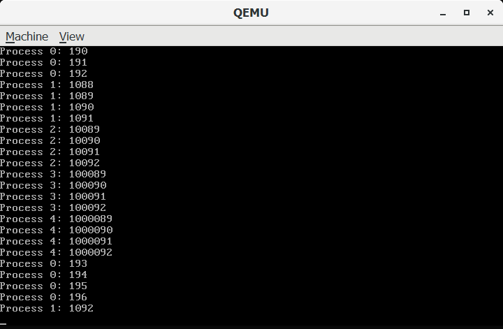 Test of the multitasking with five processes, where each one increments its internal counters and prints the value to the console. Each process manages to do these operations 4 times per time slice assigned by the OS before a switch to the next process.