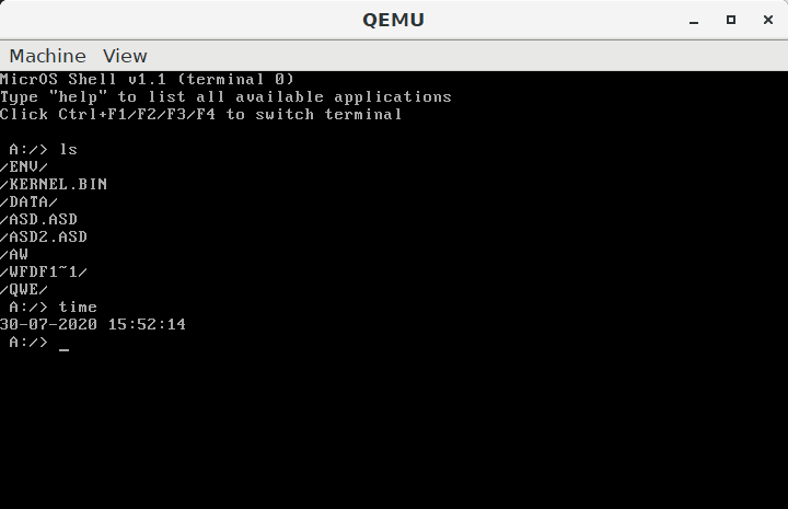 Animation presenting interaction with the MicrOS for basic operations like displaying time, list of files, changing the current directory, and executing a game.