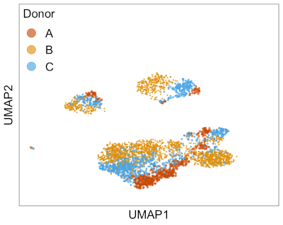 This animation shows Harmony aligning three single-cell RNA-seq datasets from different donors. → How to make this animation. Before Harmony, you can clearly distinguish cells from each of the three donors. After Harmony, the cells from different donors are mixed while preserving the overall shape of the data. This makes it easier to run clustering algorithms to find similar cell types that are present in different batches of data.