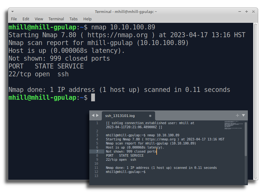 mhill@devlaptop:~$ sshlog attach [TTY ID]