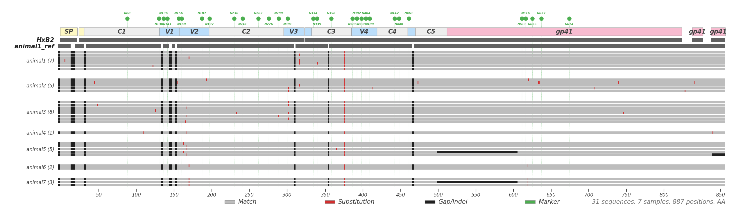Both alignments contain the same 33 sequences (HxB2, animal1_ref, and 31 sample sequences from 7 animals):