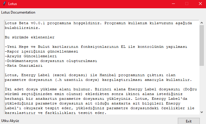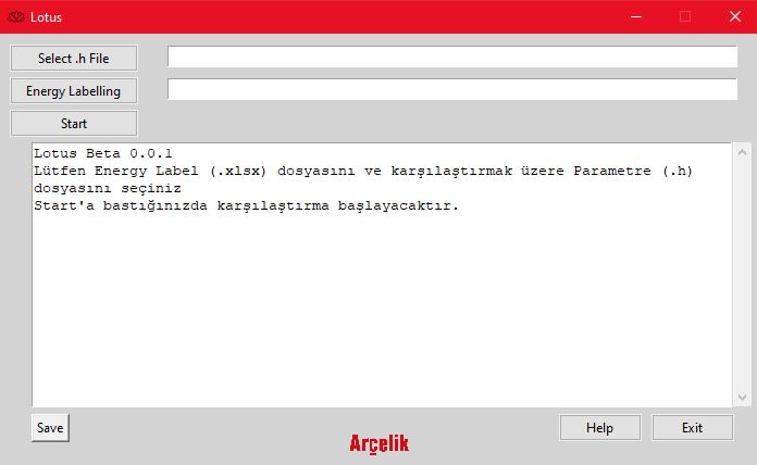 Open the Lotus program by executing the main.py file. Click the "Select .h File" button and choose a Parameter File (.h) to compare. Click the "Energy Labelling" button and choose an Energy Label (.xlsx) file to compare. Click the "Start" button to start the comparison process. The program will compare the files and display the results in the text box. The user can then save the results by clicking the "Save" button.
