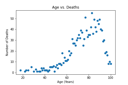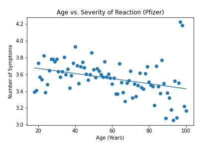 For this analysis, we tried performing linear regressions on several of the variables included in our data. The most interesting findings had to do with age, reaction severity and deaths. Deaths, on one hand, follow a skewed normal distribution, where the most deaths ocurred between people of ages 80 to 90. In terms of age and severity, younger people have stronger reactions (with more symptoms) due to the immune system slowing down with age. However, while being younger can cause you a stronger reaction, you're less likely to die from that reaction.