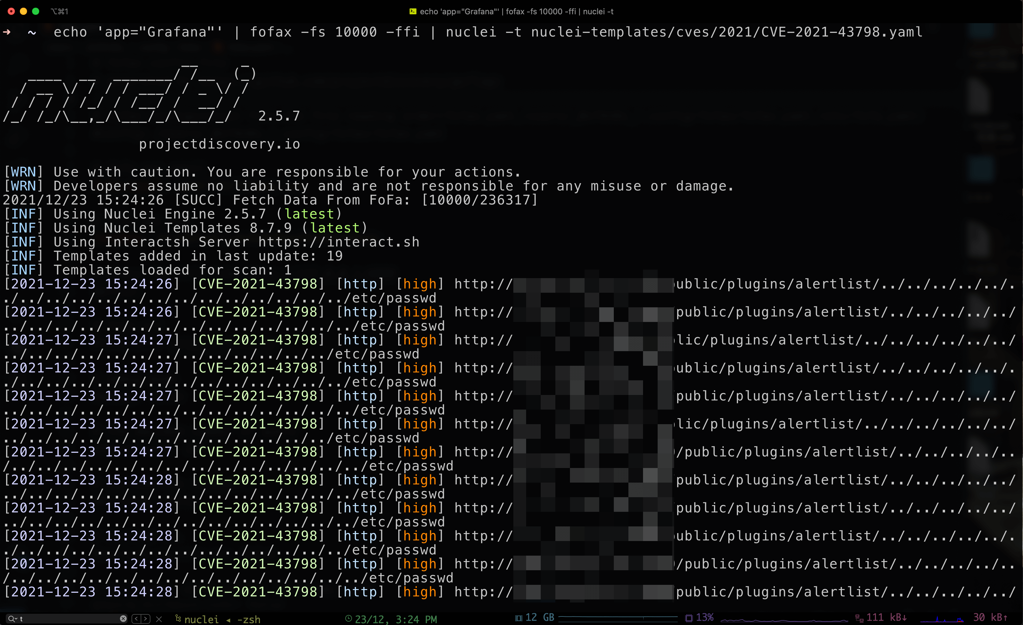 将 FoFaX 获取的数据传递到 Nuclei,然后使用 CVE-2021-43798 Template 批量漏洞扫描。
