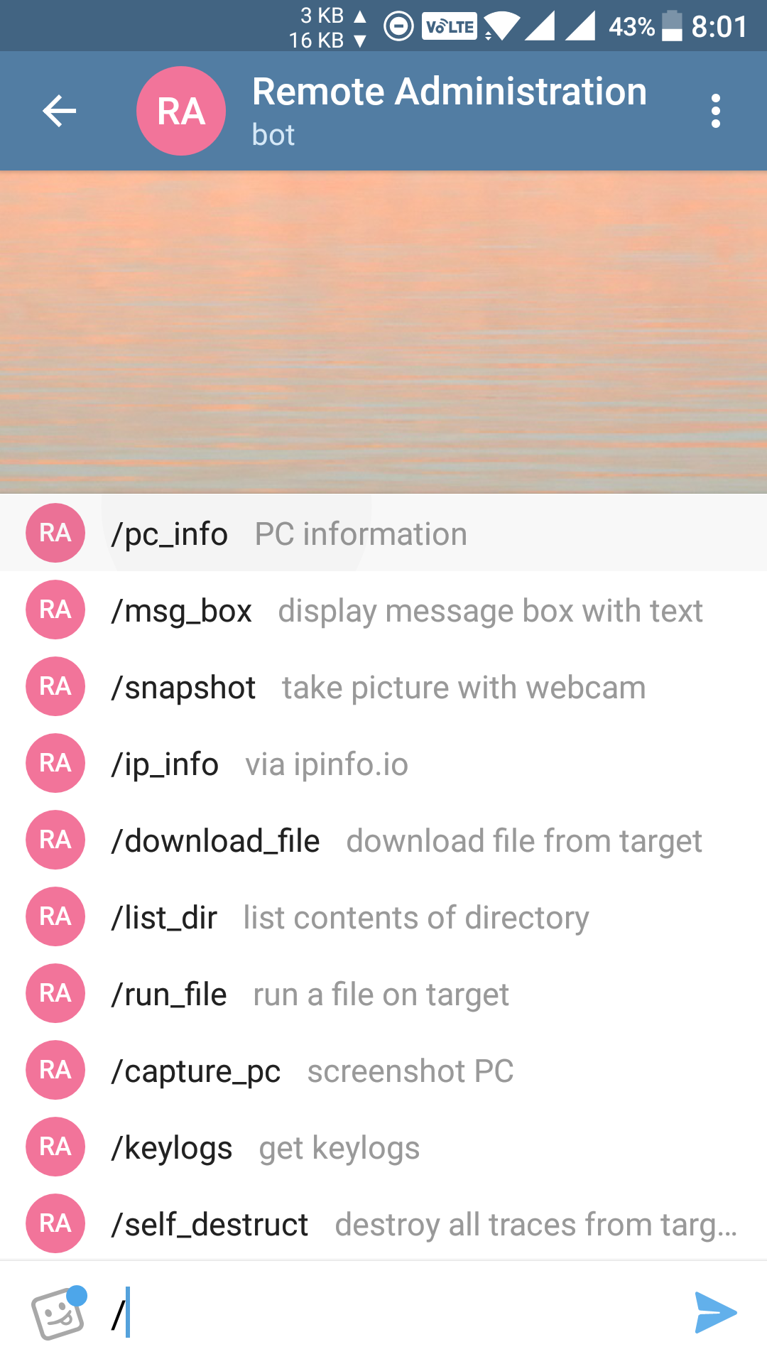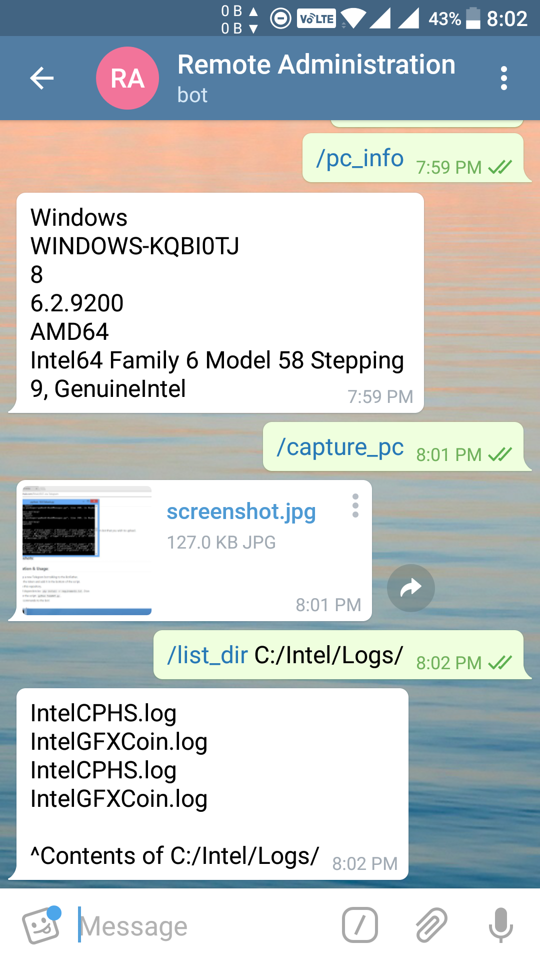 Windows Remote Administration Tool via Telegram (Python 2.7) | Originally created by Ritiek