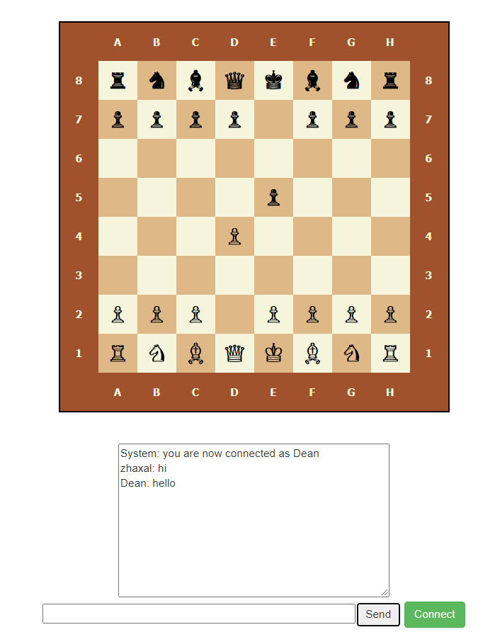 The principle: clients send data about moves and messages to the server, then the server sends this data back to the connected clients, so both clients will have same positioning on the board and they can chat with each other.